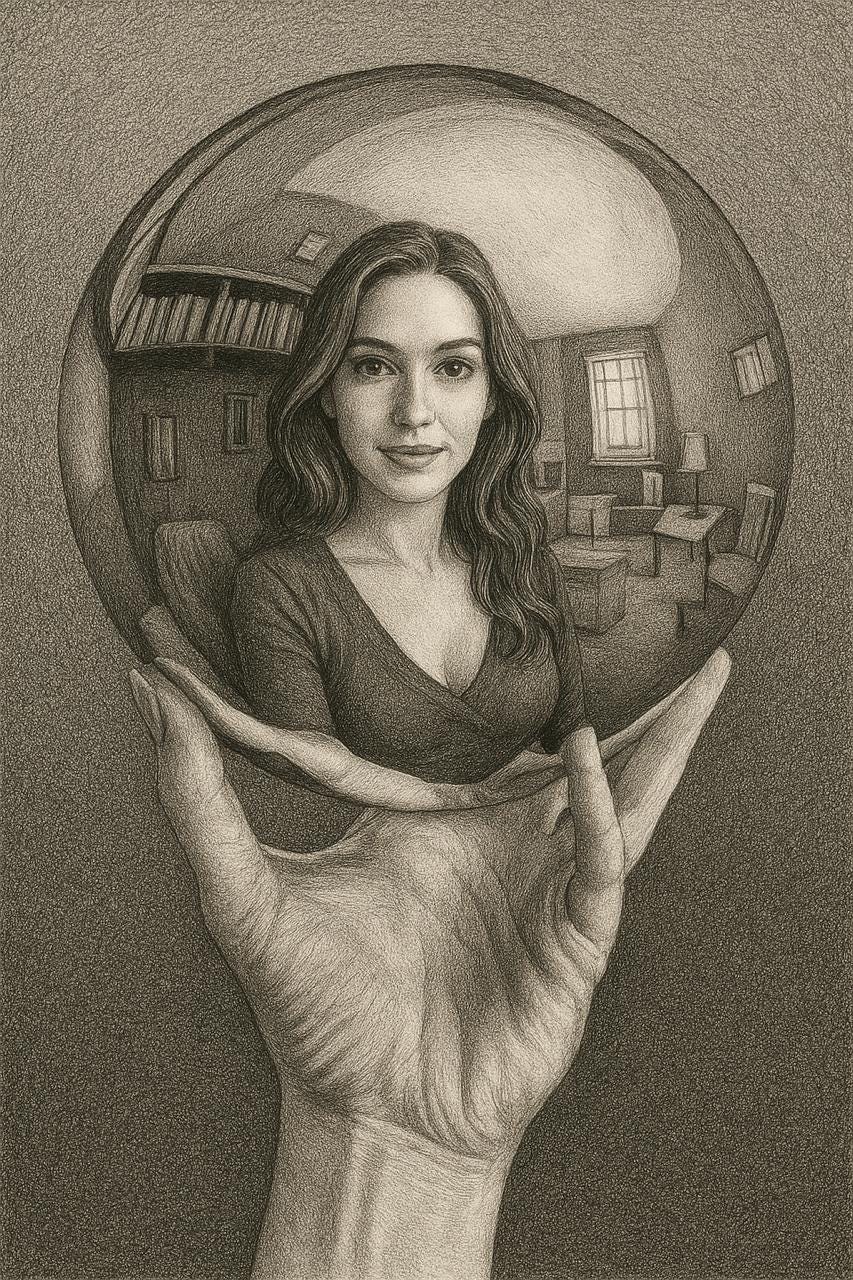 Tal qual uma esfera perfeita, refletiva e reflexiva, sem quaisquer deformidades, excessos ou faltas, que devolve a imagem de quem a observa, ou a lê — mas transformada pela sua superfície lisa e curva. É o mesmo observador, mas alterado pela superfície da esfera, ou pelas palavras dos versos e prosa. Aqui ele pode se olhar ou imaginar de formas diversas do que pensa ser — e mais polida a esfera, quanto mais habilidoso o escritor.