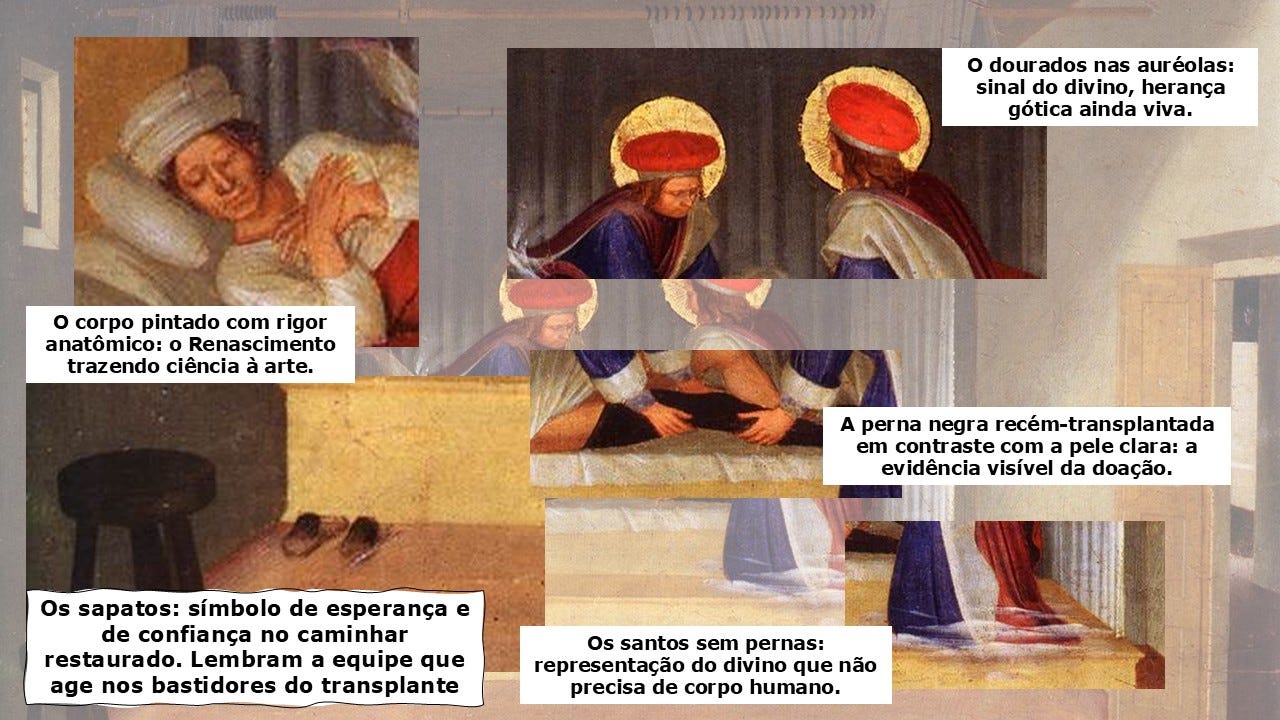 Fra Angelico representou o transplante da perna como um milagre divino, mas a simbologia dos sapatos se alinha muito com a realidade dos transplantes dos dias atuais. Pacientes debilitados recuperam a qualidade de vida sem perceber a complexidade do que aconteceu com eles, e isso coaduna muito com os ensinamentos de Thomas Kuhn, filósofo da ciência (1922-1996), que em sua A Estrutura das Revoluções Científicas (1962) descreveu que as rupturas de paradigmas que transformam a visão do mundo vêm com os avanços científicos, podendo ser tão revolucionários que evocam uma sensação de maravilha comparáveis a milagres.