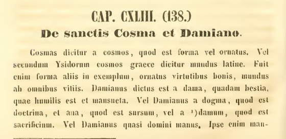 The twin saints are considered patrons of medicine, surgeons, and pharmacists, and their life and martyrdom are recorded in the hagiographic collection Legenda Aurea (1260–1275), by Jacobus de Voragine. A Dominican friar, chronicler, and Italian writer of the 13th century, living on the coast of Genoa, Italy, he compiled about 180 lives of saints, organized according to the liturgical calendar, in a literary narrative that described their lives, their virtues, their miracles, and often their martyrdoms. Due to the Dominican tradition, known for its emphasis on preaching and teaching, the work was widely disseminated in medieval Europe, serving as a source for sermons, sacred art, and popular devotion.
